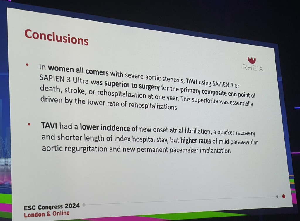 ESC Congress 2024의 Hot Line 세션에서 발표된 최신 연구에 따르면, 중증 대동맥 협착증을 가진 여성 환자에서 경피적 대동맥판막 삽입술(Transcatheter Aortic Valve Implantation, TAVI)이 외과적 대동맥판막 치환술(Surgical Aortic Valve Replacement)보다 사망, 뇌졸중 또는 재입원 감소에 우월한 것으로 나타났다.